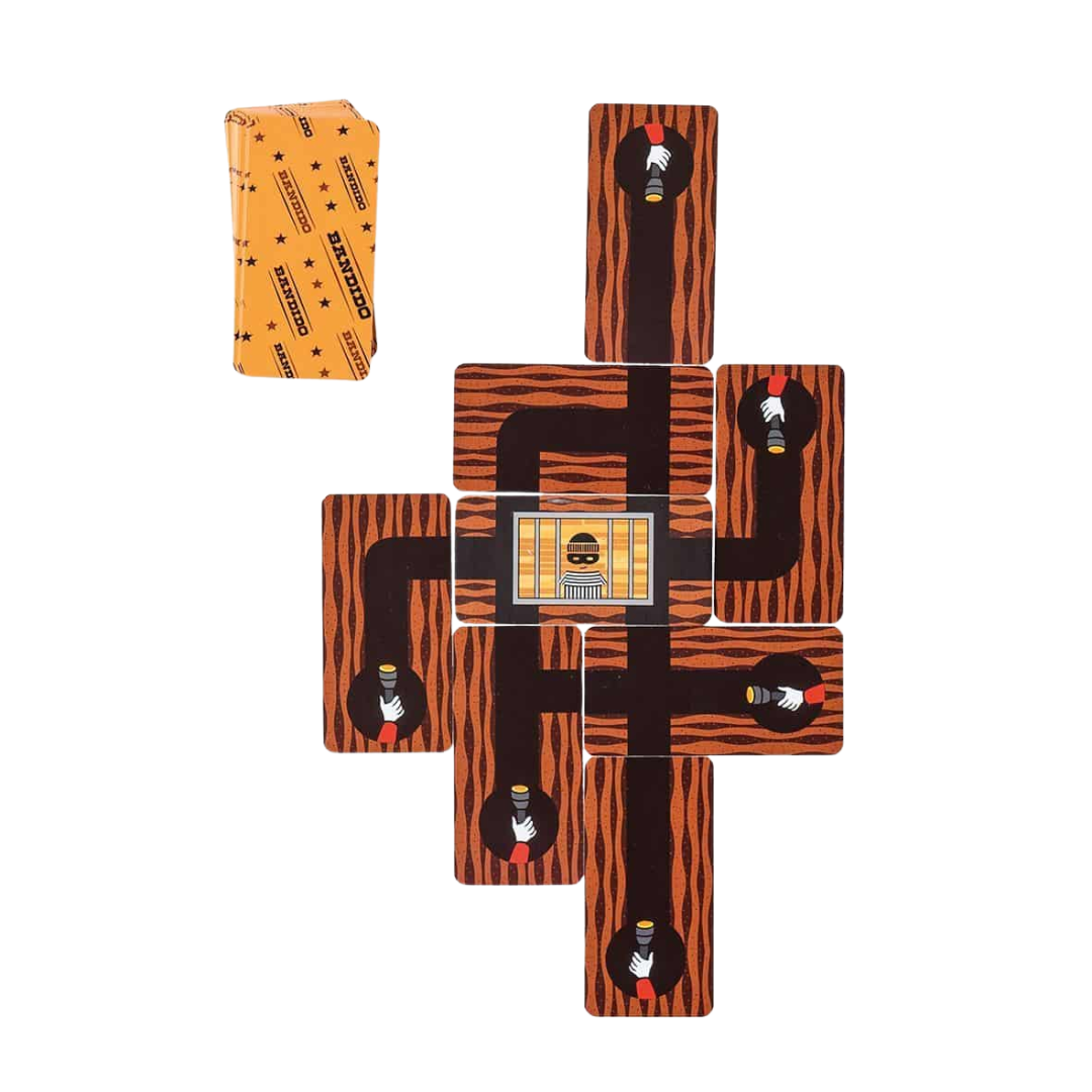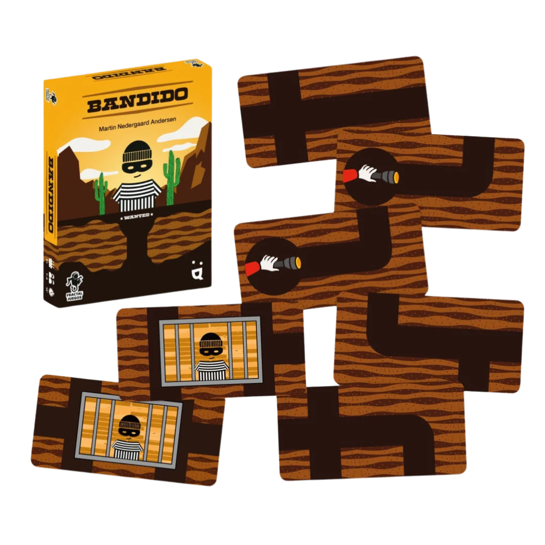 En Bandido, los jugadores colaboran para evitar que un astuto ladrón escape de su celda. La carta de inicio muestra al bandido cavando túneles, y en cada turno, los jugadores deben colocar una carta de túnel conectándola al laberinto en expansión. El objetivo es cerrar todas las salidas antes de que el mazo se agote. La comunicación y la planificación en equipo son clave para ganar.