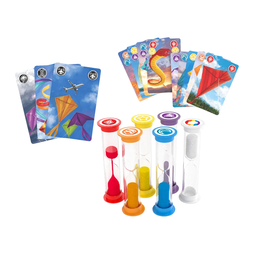 En Cometas, los jugadores colaboran para mantener en vuelo todas las cometas, representadas por relojes de arena de distintos colores. Por turnos, cada jugador debe jugar una carta de su mano que coincida con el color de un reloj de arena y, al hacerlo, voltear ese reloj para reiniciar su tiempo. El objetivo es evitar que cualquier reloj se agote mientras se juegan todas las cartas del mazo. La comunicación y la coordinación son esenciales, ya que el juego se desarrolla en tiempo real y todos deben estar atentos al estado de los relojes para mantener las cometas "volando".