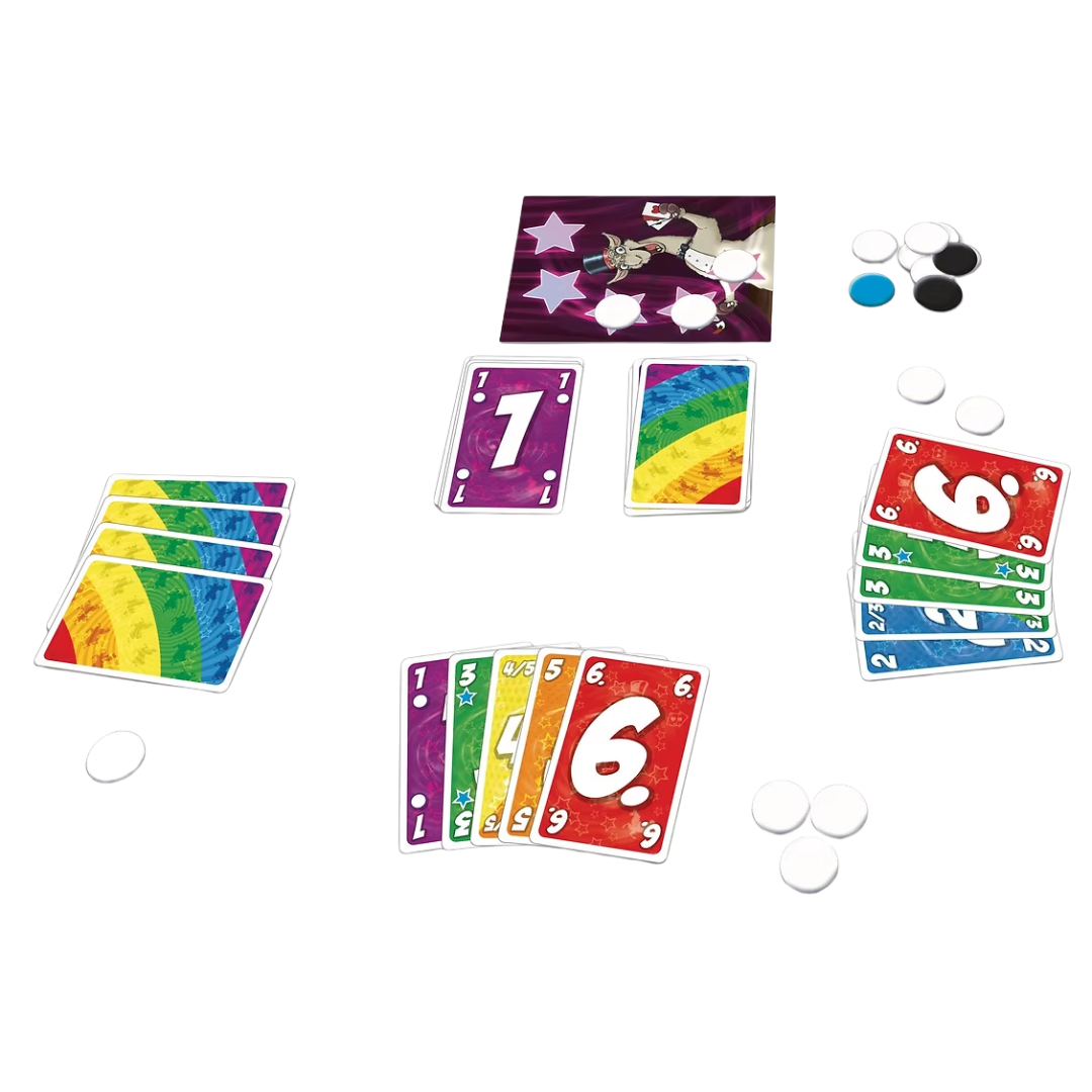 Como siempre, el objetivo es deshacerse de tus cartas antes que los demás para evitar puntos negativos. Si no puedes jugar, puedes retirarte o robar una carta. Si logras descartarte por completo, devuelves una ficha de puntuación. La partida termina cuando alguien alcanza 40 puntos, y gana quien tenga menos.