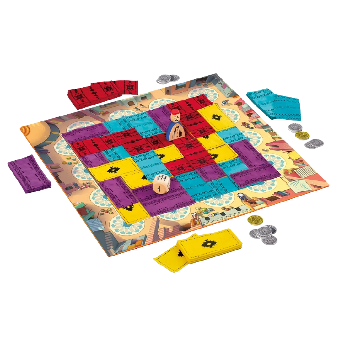 La clave está en colocar tus alfombras con astucia para cubrir otras, cobrar bien y evitar pagar demasiado. El jugador con más dinero y alfombras visibles al final, gana la partida.