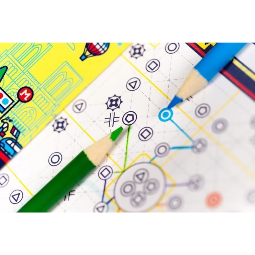 Durante 4 rondas, cada jugador utiliza un lápiz de color distinto para trazar una línea del metro parisino en su mapa personal. A medida que se revelan cartas de estación, deberás conectar símbolos respetando las guías y evitando que tu línea se cruce a sí misma.