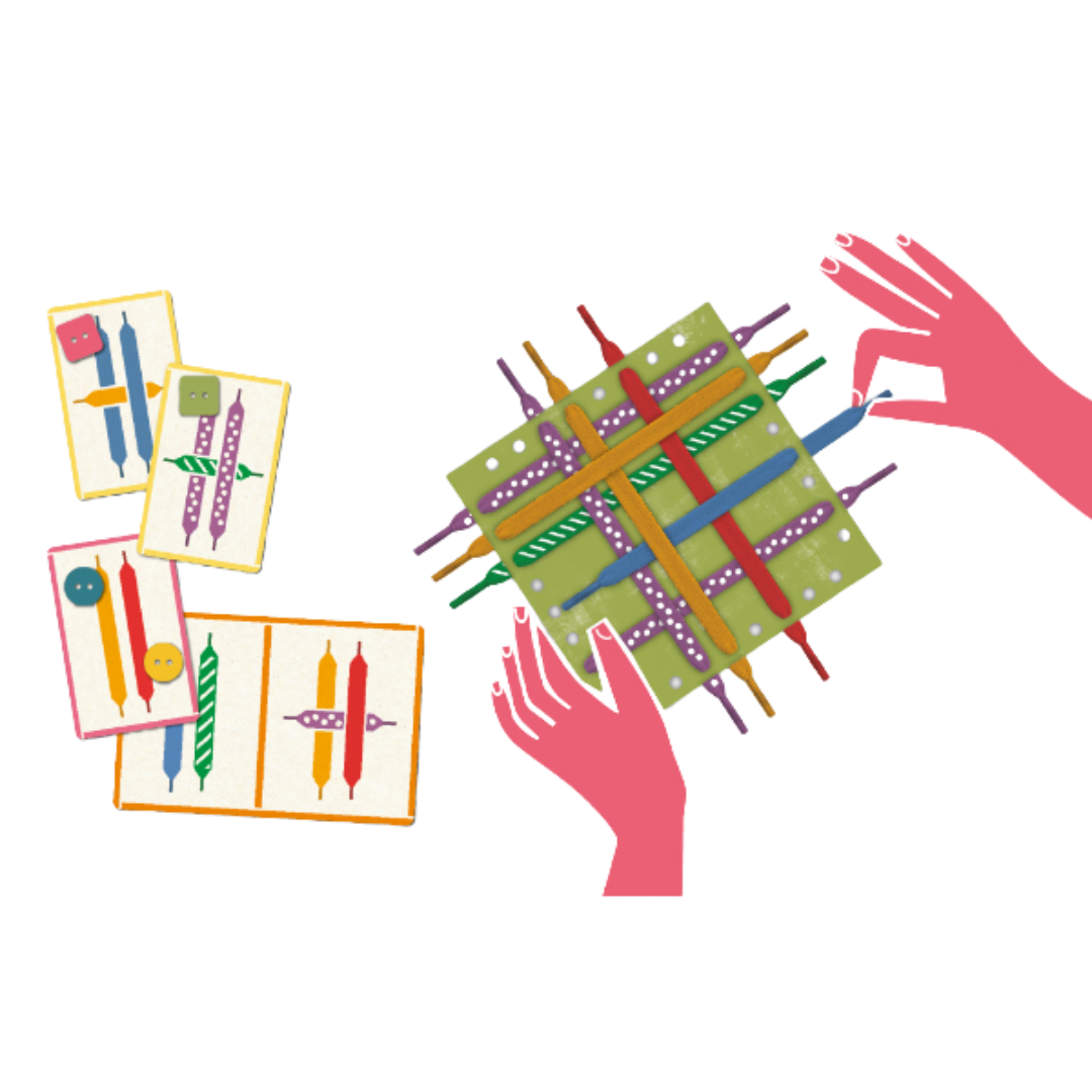 En Trama, cada jugador teje su propio tapiz usando cordeles de colores, intentando seguir patrones individuales y colectivos. En tu turno, eliges hilos para ir formando figuras en tu telar, tratando de replicar los patrones entrelazado y adyacente, o colaborando para cumplir objetivos grupales.