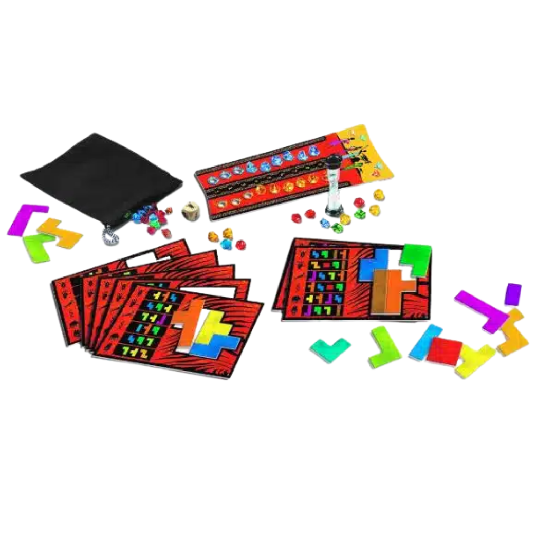 En cada ronda, los jugadores lanzan el dado, toman un tablero de desafío y deben completar la figura usando las piezas indicadas… ¡antes de que se acabe el tiempo! Quien lo logre primero, grita “¡Ubongo!” y elige gemas del centro. Todos los que completen el puzzle a tiempo también ganan recompensas.