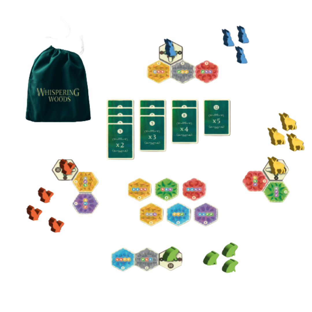 En Whispering Woods, cada jugador desarrolla su propio bosque colocando losetas hexagonales para conectar caminos y cumplir misiones que involucran a sus animales espirituales. En cada turno, puedes tomar losetas o elegir nuevas misiones para avanzar por el mapa.