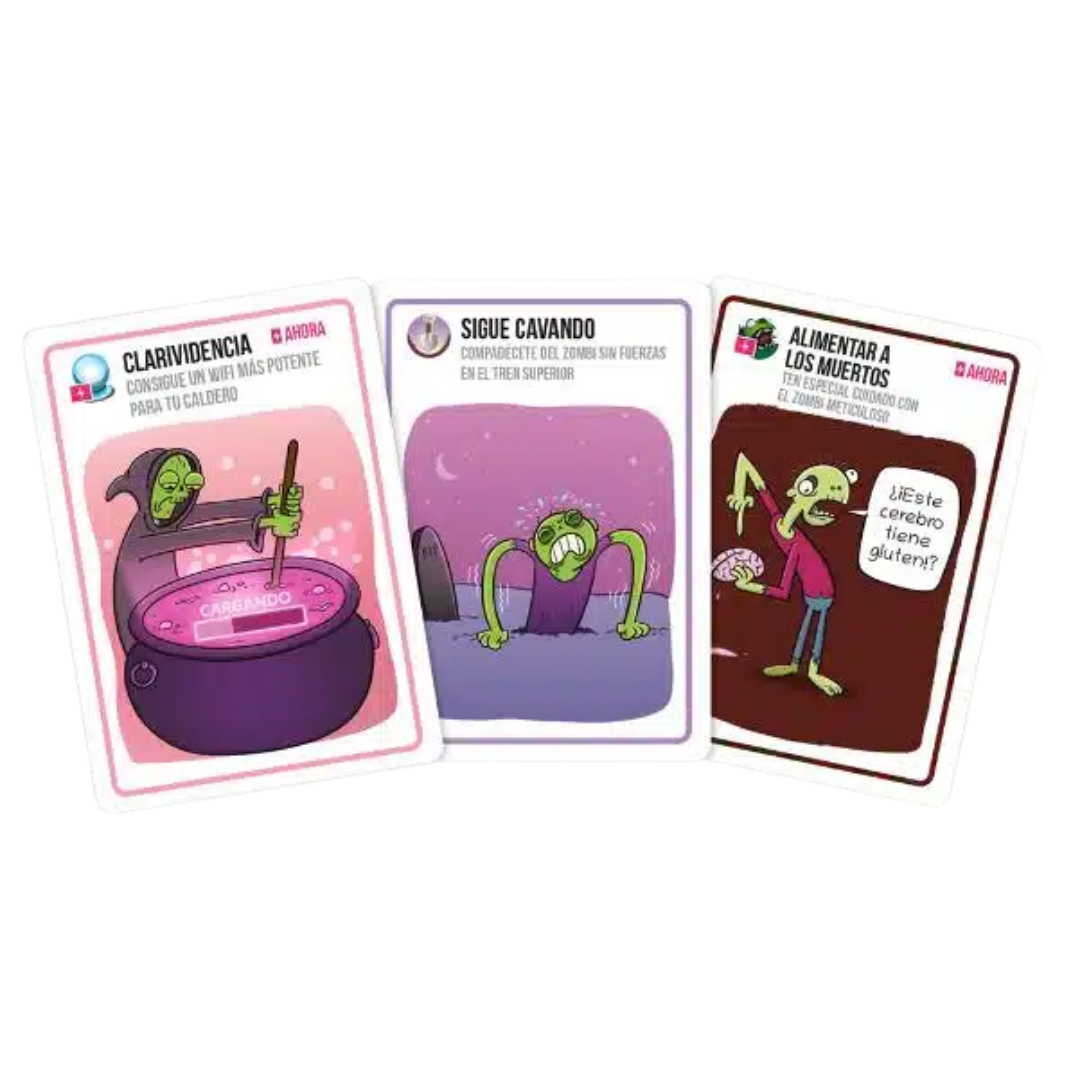 El objetivo sigue siendo el mismo: evitar explotar. Pero si lo haces, no quedas fuera... puedes volver del más allá gracias a las cartas de zombis y seguir fastidiando al resto. Juega cartas para esquivar, robar, mirar el futuro o arruinarle la jugada a alguien más. La tensión es constante, ¡y la venganza también!